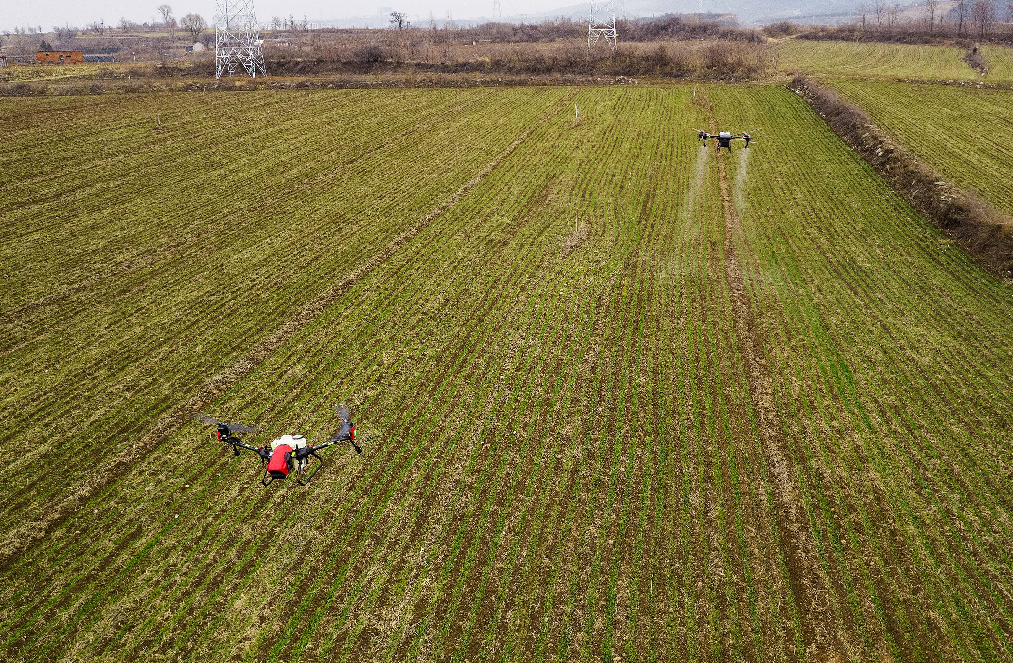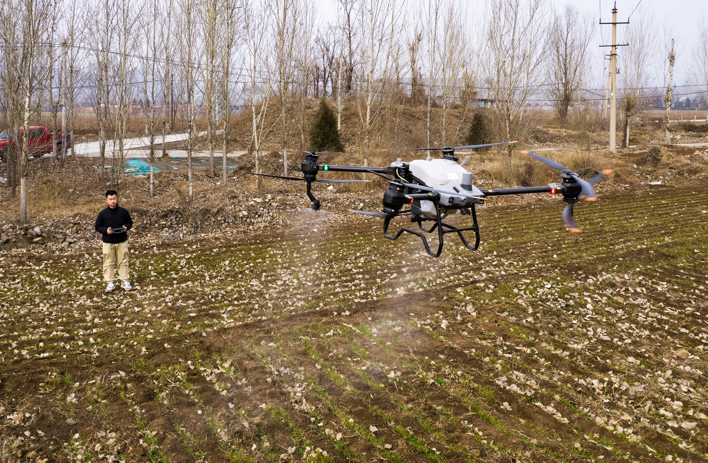 2月15日,在晉城市城區(qū)南村鎮(zhèn),操作員正熟練地遙控農(nóng)業(yè)專用無人機(jī)給麥田播撒肥料,大大提高了工作效率。