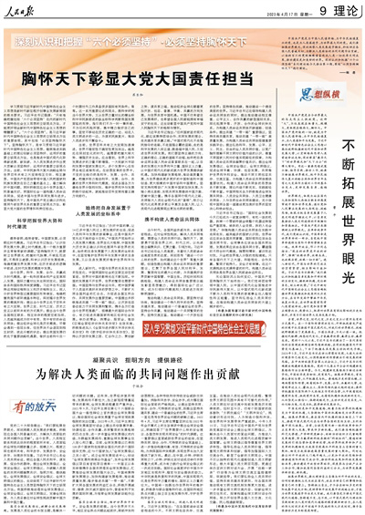 中國共產(chǎn)黨是為中國人民謀幸福、為中華民族謀復(fù)興的黨,也是為人類謀進步、為世界謀大同的黨。我們要拓展世界眼光,深刻洞察人類發(fā)展進步潮流,積極回應(yīng)各國人民普遍關(guān)切,為解決人類面臨的共同問題作出貢獻,以海納百川的寬闊胸襟借鑒吸收人類一切優(yōu)秀文明成果,推動建設(shè)更加美好的世界。深刻認識和把握“六個必須堅持”系列理論版今天推出第六期,圍繞“必須堅持胸懷天下”進行闡述。