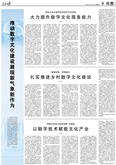 建設(shè)數(shù)字中國(guó)是數(shù)字時(shí)代推進(jìn)中國(guó)式現(xiàn)代化的重要引擎,是構(gòu)筑國(guó)家競(jìng)爭(zhēng)新優(yōu)勢(shì)的有力支撐。數(shù)字文化建設(shè)是數(shù)字中國(guó)建設(shè)的重要組成部分。習(xí)近平總書記在黨的二十大報(bào)告中指出:“實(shí)施國(guó)家文化數(shù)字化戰(zhàn)略,健全現(xiàn)代公共文化服務(wù)體系,創(chuàng)新實(shí)施文化惠民工程。”這為我們推進(jìn)數(shù)字文化建設(shè)指明了前進(jìn)方向、提供了根本遵循。新時(shí)代新征程,如何提升數(shù)字文化服務(wù)能力?如何推動(dòng)數(shù)字文化產(chǎn)業(yè)高質(zhì)量發(fā)展?如何扎實(shí)推進(jìn)鄉(xiāng)村數(shù)字文化建設(shè)?本期觀察版圍繞這些問(wèn)題進(jìn)行探討。