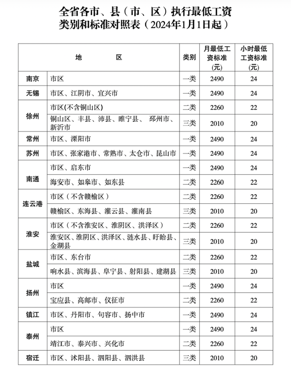 通知顯示,根據(jù)《最低工資規(guī)定》(原勞動保障部令第21號)和《江蘇省工資支付條例》規(guī)定,經(jīng)省人民政府同意,從2024年1月1日起調(diào)整全省最低工資標(biāo)準(zhǔn)。調(diào)整后,全省月最低工資標(biāo)準(zhǔn)為:南京、蘇州、無錫、常州、鎮(zhèn)江五市及南通市區(qū)、揚(yáng)州市區(qū)、泰州市區(qū)等一類地區(qū)2490元;徐州市區(qū)(不含銅山區(qū))、連云港市區(qū)(不含贛榆區(qū))等二類地區(qū)2260元;宿遷全市等三類地區(qū)2010元。非全日制用工小時最低工資標(biāo)準(zhǔn):一類地區(qū)24元,二類地區(qū)22元,三類地區(qū)20元。
