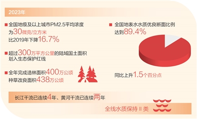 2023年,全國地級及以上城市PM2.5平均濃度為30微克/立方米,比2019年下降16.7%;全國地表水水質(zhì)優(yōu)良斷面比例達(dá)到89.4%,同比上升1.5個百分點;超過300萬平方公里的陸域國土面積劃入生態(tài)保護紅線。