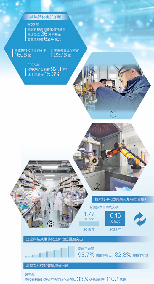 印發(fā)《“十四五”技術(shù)要素市場(chǎng)專項(xiàng)規(guī)劃》,從健全科技成果產(chǎn)權(quán)制度、強(qiáng)化高質(zhì)量科技成果供給等方面推動(dòng)成果轉(zhuǎn)化;印發(fā)《專利轉(zhuǎn)化運(yùn)用專項(xiàng)行動(dòng)方案(2023—2025年)》,對(duì)專利轉(zhuǎn)化運(yùn)用進(jìn)行專門部署;制定《高校和科研機(jī)構(gòu)存量專利盤活工作方案》,發(fā)揮市場(chǎng)和政府的協(xié)同作用,共同推動(dòng)專利成果更好更快地轉(zhuǎn)化為現(xiàn)實(shí)生產(chǎn)力……近年來(lái),一系列部署,一項(xiàng)項(xiàng)探索,讓創(chuàng)新鏈的好技術(shù)變成產(chǎn)業(yè)鏈的新應(yīng)用,科技創(chuàng)新正在成為培育發(fā)展新質(zhì)生產(chǎn)力的新動(dòng)能。