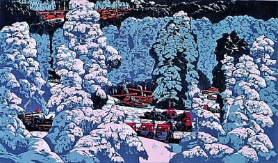 充滿粗獷刀味和雄渾之氣的色塊構(gòu)成,是晁楣版畫的魅力所在。他的藝術(shù)風(fēng)格從何而來?答案源于其在創(chuàng)作實踐中的自我體悟。在藝術(shù)創(chuàng)作中,晁楣深刻把握了藏與露、簡與繁、整體與局部等多對概念之間的對立統(tǒng)一關(guān)系。與以人為主要表現(xiàn)對象的傳統(tǒng)黑白木刻有所不同,他的套色木刻以北大荒雄渾壯闊的風(fēng)景為主要題材。大色塊的構(gòu)成可以鮮明地表現(xiàn)山川、樹木的色彩關(guān)系,遠(yuǎn)景的人物因形象被縮小,化作外形概括的色塊,為畫面提供了精彩的細(xì)節(jié)。如《北方九月》《戰(zhàn)油?!贰都t裝素裹》《秋歌》《松谷》等作品,皆是在鳥瞰式的場景中以大色塊鋪陳畫面,再將人、鷹、馬、車等物象轉(zhuǎn)化為斑斕的色塊點綴其中,使得作品既有宏觀的場景表現(xiàn),亦有微觀的敘事呈現(xiàn),兩者相得益彰、相映成趣,呈現(xiàn)出濃郁的個人創(chuàng)作風(fēng)格。