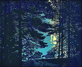 面對彼時套色木刻創(chuàng)作存在的這一問題,晁楣通過不懈研究與探索找到了解決的方法。他放棄了過去以黑線勾勒輪廓再以彩色填充的方式,大膽采用色塊拼接的新方法,將黑色與彩色并置在畫面中,使黑色輪廓線融入暗部,統(tǒng)一為一個個整體色塊。晁楣強調(diào),套色木刻中不能沒有黑色,因為它在畫面中發(fā)揮著重要的作用。這種“剪影式”的構(gòu)圖大量削減了輪廓線在畫面中的應(yīng)用,帶來強烈的色彩對比以及極具視覺張力的疏密關(guān)系,使得畫面結(jié)構(gòu)主次分明,保持了作品的整體感。試看晁楣的套色木刻作品《北陲屏障》,逆光的環(huán)境中,頂天立地、枝繁葉茂的松樹剪影占據(jù)了畫面的大部分空間,在遠(yuǎn)處光源的照耀下,一隊騎乘戰(zhàn)馬的巡邏兵疾馳而過,形成了動靜交織的畫面節(jié)奏。作品用為數(shù)不多的色彩營造光感,套色簡潔自然,茂密枝干交織形成的無數(shù)小色塊,展現(xiàn)出藝術(shù)家精湛的運刀技藝。