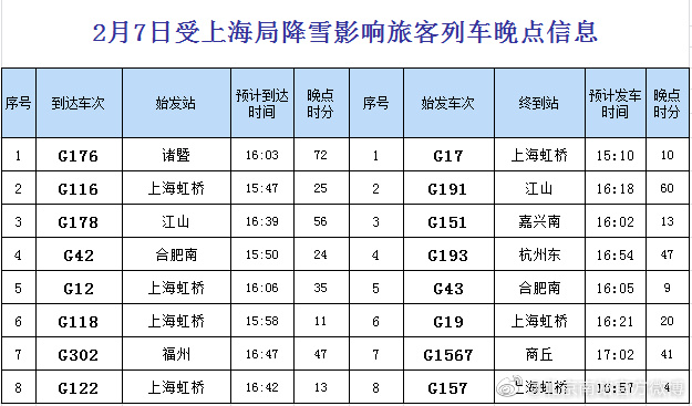 據(jù)@北京南站官方微博消息,受上海局降雪影響,北京南站京滬高鐵部分到達(dá)、始發(fā)列車有不同程度晚點(diǎn)。截至目前,具體晚點(diǎn)情況信息如下,請(qǐng)廣大旅客及時(shí)關(guān)注12306官方信息和車站公告。