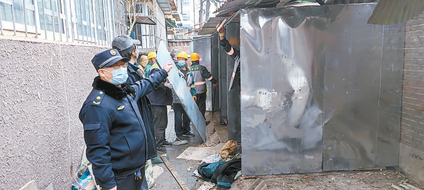 廣安門(mén)內(nèi)街道綜合執(zhí)法隊(duì)工作人員正在對(duì)私建鐵皮棚進(jìn)行拆除。
