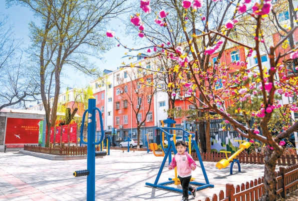大興區(qū)興豐街道老小區(qū)黃村西里社區(qū)在居民的共同維護(hù)下,居住環(huán)境整潔舒適。圖為提升后的社區(qū)廣場上,小朋友正在樂享春光。本報(bào)記者 武亦彬攝