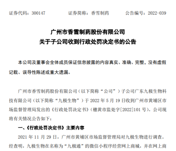 對(duì)此,香雪制藥表示,已要求九極生物主動(dòng)調(diào)整生產(chǎn)計(jì)劃,更改下架相關(guān)廣告;對(duì)相關(guān)責(zé)任人員進(jìn)行處罰;組織工作人員對(duì)相關(guān)法律法規(guī)進(jìn)行學(xué)習(xí),完善內(nèi)部管理制度與操作規(guī)程,嚴(yán)格按照規(guī)定對(duì)產(chǎn)品宣傳進(jìn)行規(guī)范管理。截至本公告披露日前,相關(guān)整改已完成。