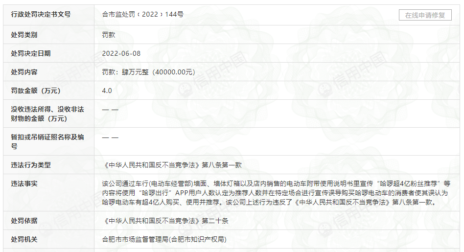 央廣網(wǎng)北京6月27日消息(記者于琦)因廣告宣傳誤導(dǎo)消費(fèi)者,哈啰關(guān)聯(lián)公司上海鈞哈網(wǎng)絡(luò)科技有限公司被處以40000元的罰款,處罰單位為合肥市市場監(jiān)督管理局(合肥市知識(shí)產(chǎn)權(quán)局)。