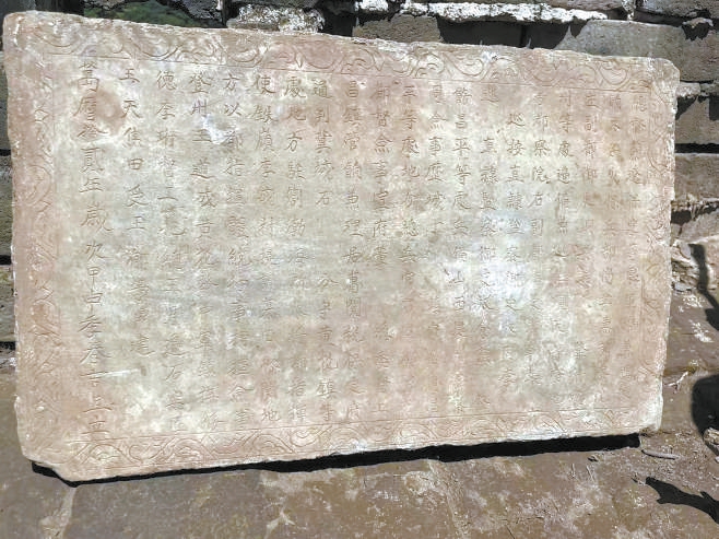 “發(fā)現(xiàn)一塊石碑,出土時碑文一面向下,推測這塊石碑原來鑲嵌在北側(cè)垛口墻內(nèi)側(cè),墻體傾斜倒塌后,石碑脫落?!表椖靠脊咆撠熑?、北京考古研究院副研究員尚珩介紹。石碑為青石材質(zhì),保存完整,邊框刻著纏枝卷草紋。因為脫落時碑文面朝下,因此碑文保存完好,字體為繁體字,字跡娟秀,清晰可辨。