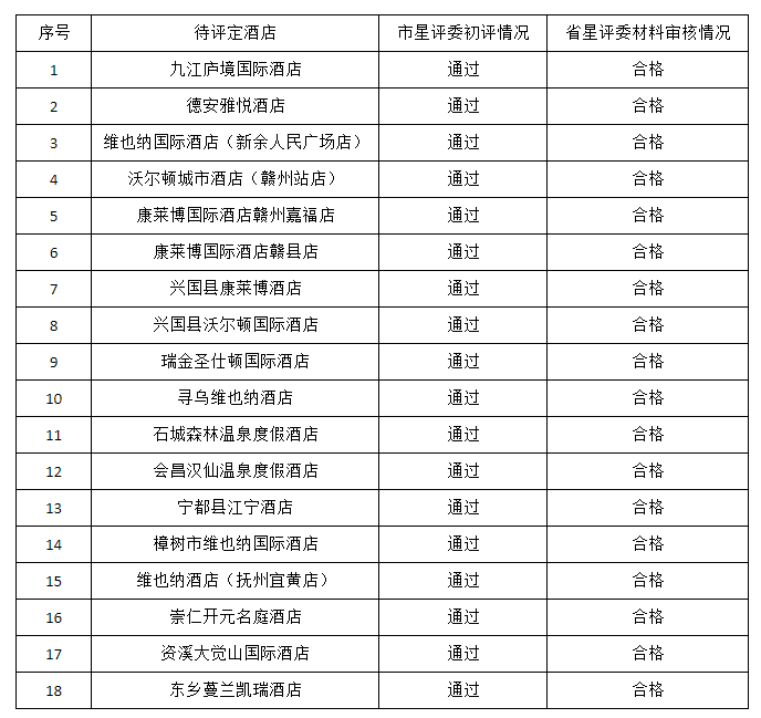 央廣網(wǎng)北京10月11日消息 據(jù)江西省文化和旅游廳消息,江西省星評委依據(jù)《旅游飯店星級的劃分與評定》(GB/T14308-2010)國家標(biāo)準(zhǔn)的相關(guān)要求,經(jīng)過相關(guān)酒店企業(yè)申請,相關(guān)評定委員會評定,現(xiàn)將待評四星級旅游飯店的十八家酒店進(jìn)行評定前公示。
