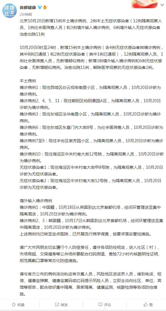 北京10月20日新增15例本土確診病例、2例本土無癥狀感染者