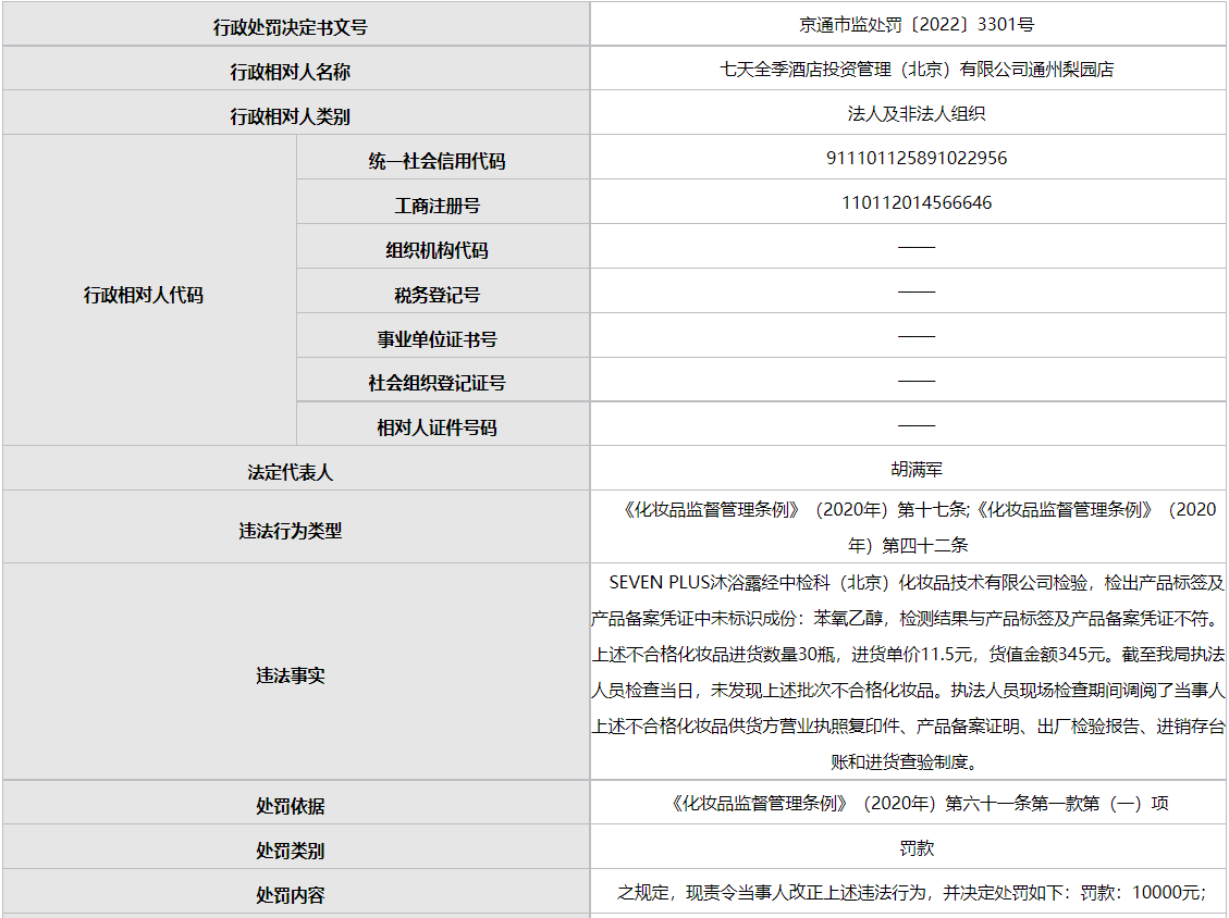 據(jù)文號為“京通市監(jiān)處罰〔2022〕3301號”行政處罰決定書顯示,七天酒店梨園店具體違法事實(shí)為:SEVEN PLUS沐浴露經(jīng)中檢科(北京)化妝品技術(shù)有限公司檢驗(yàn),檢出產(chǎn)品標(biāo)簽及產(chǎn)品備案憑證中未標(biāo)識成份:苯氧乙醇,檢測結(jié)果與產(chǎn)品標(biāo)簽及產(chǎn)品備案憑證不符。上述不合格化妝品進(jìn)貨數(shù)量30瓶,進(jìn)貨單價(jià)11.5元,貨值金額345元。