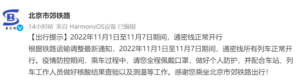 央廣網北京11月1日消息 據(jù)北京市郊鐵路官方微博消息,根據(jù)鐵路運輸調整最新通知,2022年11月1日至11月7日期間,通密線所有列車正常開行。
