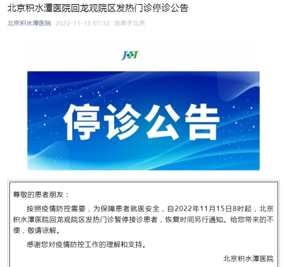 據(jù)北京積水潭醫(yī)院微信公眾號(hào)消息,按照疫情防控需要,為保障患者就醫(yī)安全,自2022年11月15日8時(shí)起,北京積水潭醫(yī)院回龍觀院區(qū)發(fā)熱門(mén)診暫停接診患者,恢復(fù)時(shí)間另行通知。給您帶來(lái)的不便,敬請(qǐng)諒解。
