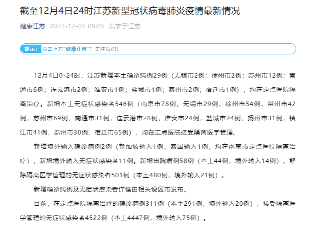 央廣網(wǎng)南京12月5日消息(記者王錫斐)據(jù)“健康江蘇”微信公眾號消息,12月4日0-24時,江蘇新增本土確診病例29例(無錫市2例;徐州市2例;蘇州市12例;南通市6例;連云港市2例;淮安市1例;鹽城市1例;泰州市2例;宿遷市1例),均在定點(diǎn)醫(yī)院隔離治療。新增本土無癥狀感染者546例(南京市78例,無錫市29例,徐州市54例,常州市42例,蘇州市69例,南通市31例,連云港市28例,淮安市24例,鹽城市24例,揚(yáng)州市31例,鎮(zhèn)江市41例,泰州市30例,宿遷市65例),均在定點(diǎn)醫(yī)院接受隔離醫(yī)學(xué)管理。