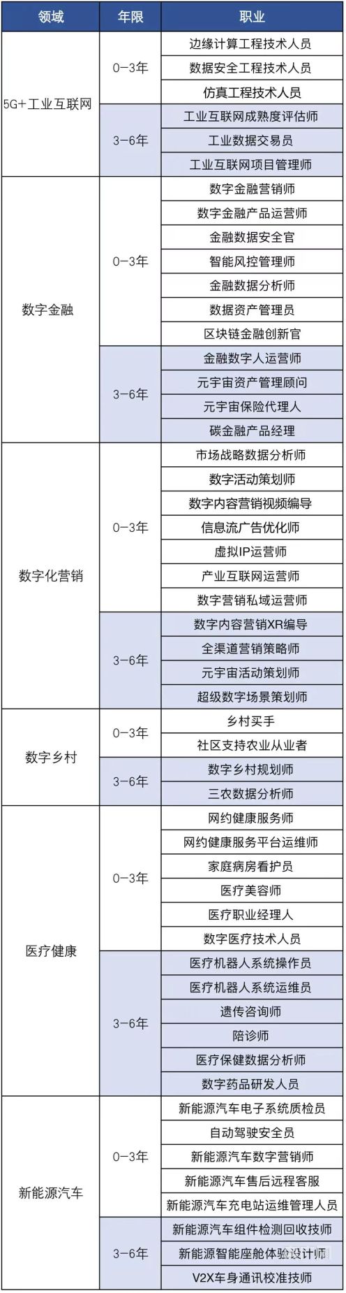 此次發(fā)布的52個未來職業(yè)“高清畫像”,涉及涵蓋醫(yī)療健康、5G+工業(yè)互聯(lián)網(wǎng)、數(shù)字化營銷、數(shù)字金融、數(shù)字鄉(xiāng)村、新能源汽車等六大領(lǐng)域,依據(jù)發(fā)展成熟度分為0-3年與3-6年兩個階段,既可以看到新技術(shù)、新業(yè)態(tài)和新模式場景下,原有職業(yè)內(nèi)涵發(fā)生變化的更新性職業(yè),也可以看到全新職業(yè)類型,不僅明確了職業(yè)定義,細(xì)化了主要工作任務(wù),更進(jìn)一步列出了具體技能要求清單。