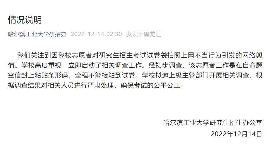 央廣網哈爾濱12月14日消息(記者馬俊瑋)12月14日,哈爾濱工業(yè)大學研究生招生辦公室通報:我們關注到因我校志愿者對研究生招生考試試卷袋拍照上網不當行為引發(fā)的網絡輿情。學校高度重視,立即啟動了相關調查工作。經初步調查,該志愿者工作是在自命題空信封上粘貼條形碼,全程不能接觸到試卷。學校擬邀上級主管部門開展相關調查,根據調查結果對相關人員進行嚴肅處理,確??荚嚨墓焦?。