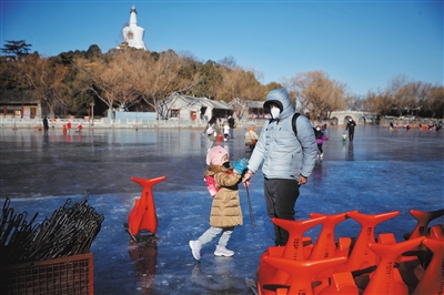 北海公園自古就有“冬宮”之美稱,據(jù)史料記載,北海歷史上有“冰嬉之制”,慈禧太后曾在冬季到北海觀看冰嬉表演,光緒帝曾在北海太液池上乘坐冰橇。記者29日在南門荷花湖看到,湖面冰層凍得厚實,冰場剛一開門,不少游客已經迫不及待入場,在冰面上玩起了冰車。