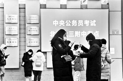 昨日早上8點,北京師范大學第三附屬中學的考點已有考生陸續(xù)到場。一些公考輔導機構在考點門前派發(fā)復習資料,北京青年報記者看到,黨的二十大報告,北京冬奧會、冬殘奧會,2022年中央一號文件等時事熱點都被列為重點內(nèi)容。8點20分,考生開始入場。工作人員手持測溫儀,對每個考生進行測溫??键c內(nèi)的一樓也設置了兩個備用考場。據(jù)悉,按照要求,有發(fā)熱(體溫≥37.3℃)等可疑癥狀的,應服從安排在備用考場佩戴N95口罩參加考試。