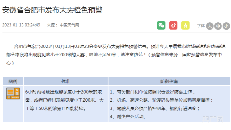 央廣網(wǎng)合肥1月13日消息(記者鮑玉嬋)記者從安徽省氣象局獲悉,合肥市氣象臺(tái)2023年01月13日03時(shí)23分變更發(fā)布大霧橙色預(yù)警信號(hào)。預(yù)計(jì)今天早晨我市繞城高速和機(jī)場(chǎng)高速部分路段將出現(xiàn)能見度小于200米的大霧,局地不足50米,請(qǐng)注意防范!
