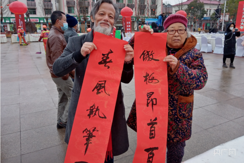 在書法展位,藝術家們也忙碌著,現(xiàn)場書寫春聯(lián)送給當地居民。寒冷的天氣沒有阻擋藝術家們創(chuàng)作的熱情,他們鋪開紙、備好墨、拿起筆,將心底的祝福落于紙上。玉龍鎮(zhèn)居民李昌蘭拿著剛得到的“春風執(zhí)筆一枝翠,傲梅昂首百花最”春聯(lián)笑得合不攏嘴:“我回去就把這副春聯(lián)貼在門前!”(陳發(fā)源 徐云卿)