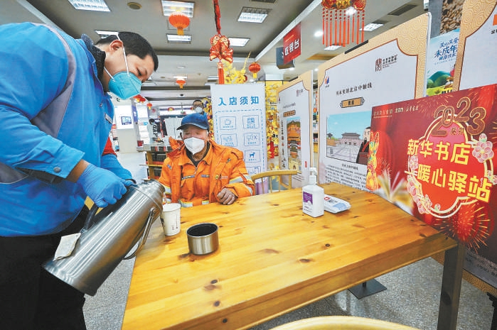 新華書(shū)店開(kāi)設(shè)暖心驛站,為環(huán)衛(wèi)工人、快遞小哥等免費(fèi)提供熱水和休息場(chǎng)所。本報(bào)記者 程功攝