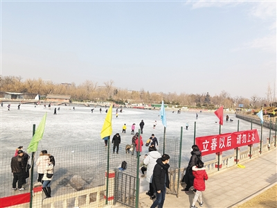 但這并沒完全驅(qū)散人們對滑冰的熱情。2月5日,新京報記者來到奧林匹克公園龍形水系、八一湖、南護(hù)城河等多處水域發(fā)現(xiàn),“禁滑野冰”的條幅懸掛在旁邊,有安保人員在岸邊巡視,隨時勸返企圖上冰的游玩者。雖然多數(shù)市民能遵守規(guī)定,但仍有個別“冒險者”不顧勸阻,憑肉眼判斷和往年經(jīng)驗(yàn),堅(jiān)持上冰。