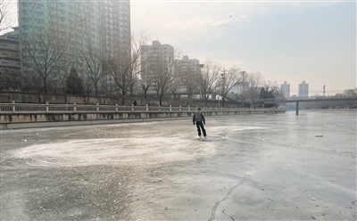 2月5日,南護(hù)城河,一位市民在滑冰。新京報記者 徐巧麗 攝