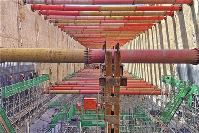 在北京地鐵22號(hào)線(平谷線)管莊站項(xiàng)目現(xiàn)場(chǎng),在地下31米,工人們正在進(jìn)行鋼筋綁扎、混凝土澆筑工作,300余名工人正在為該車(chē)站主體結(jié)構(gòu)施工完成作出努力。