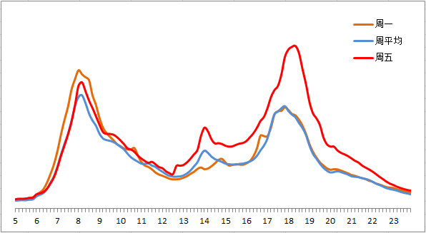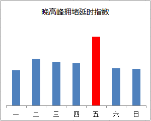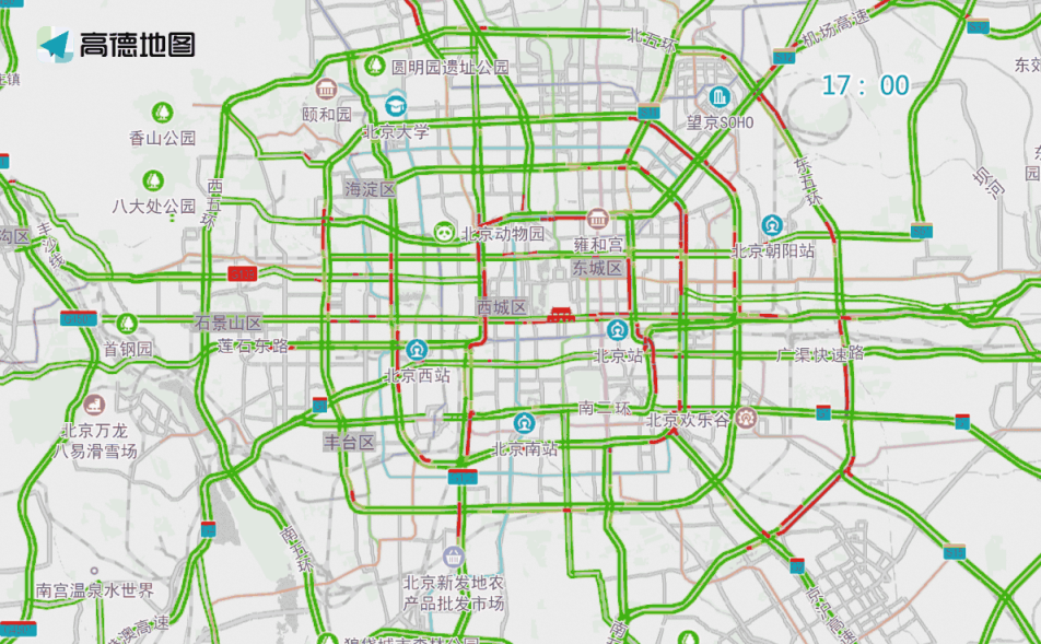 晚高峰期間,東、西、北二、三、四、五環(huán),東六環(huán)部分路段,以及萬泉河路至圓明園西路、通惠河北路、蓮石東路等城區(qū)道路出城方向車流集中,京藏高速、京承高速、京通快速、京港澳高速、機(jī)場高速等高速公路出京方向?qū)⒊霈F(xiàn)高峰車流,高峰時段為17:00—19:00,周五晚高峰提前且持續(xù)時間較長。