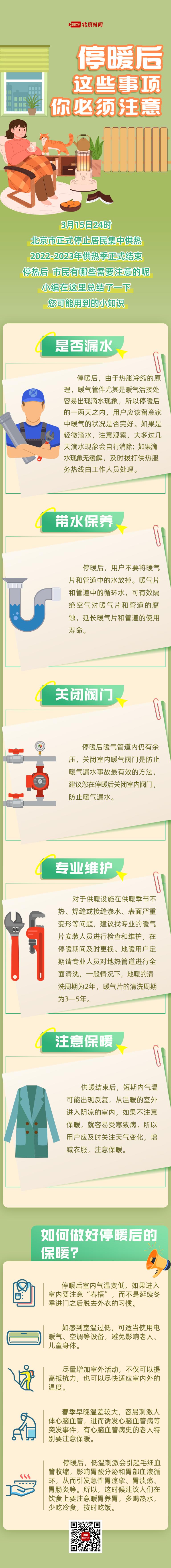 今日(16日)起,北京市正式停止居民集中供熱,都有哪些注意事項?首先要做好供熱設(shè)備的維護,包括及時檢測暖氣管道是否漏水,不要放掉暖氣管道中的水,停暖后及時關(guān)閉室內(nèi)閥門并安排專業(yè)人員對供暖設(shè)施進行維護和清洗。在停暖后還需注意保暖,如注意“春捂”,增加室外活動,注重心血管和腸胃的保暖,避免早晚溫差刺激。停暖知識帖來了,戳圖了解→