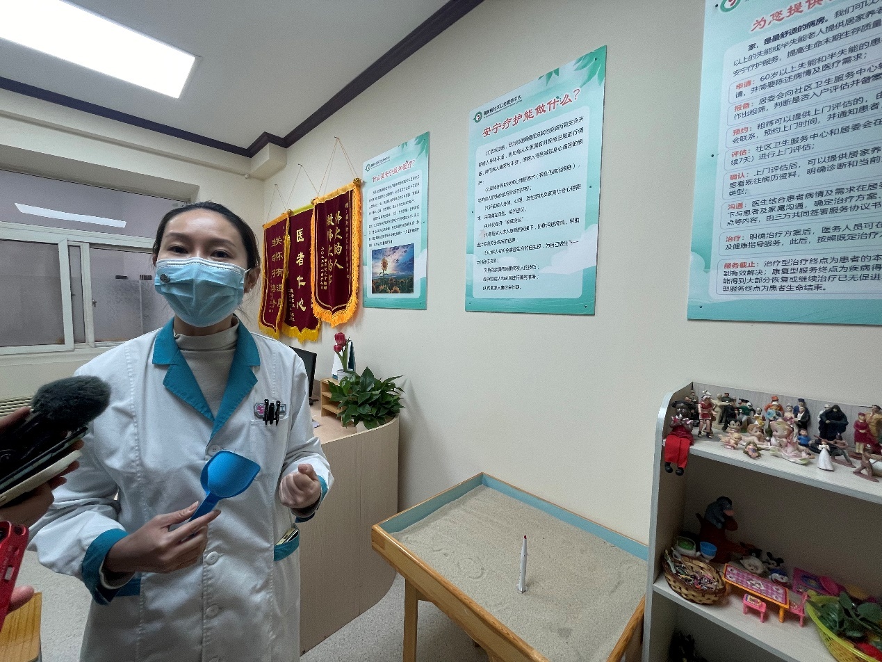 蒲黃榆社區(qū)衛(wèi)生服務(wù)中心安寧療護(hù)社工向記者介紹心理沙盤