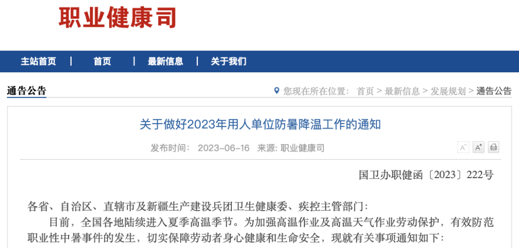 通知指出,目前,全國(guó)各地陸續(xù)進(jìn)入夏季高溫季節(jié)。近年來,夏季高溫作業(yè)及高溫天氣作業(yè)導(dǎo)致勞動(dòng)者中暑死亡的事件時(shí)有發(fā)生,對(duì)勞動(dòng)者身心健康和生命安全造成嚴(yán)重威脅。各級(jí)衛(wèi)生健康行政部門和疾控主管部門要進(jìn)一步明確工作責(zé)任,加強(qiáng)組織領(lǐng)導(dǎo),系統(tǒng)謀劃部署,協(xié)同推進(jìn)用人單位防暑降溫工作和各項(xiàng)職業(yè)病預(yù)防工作。