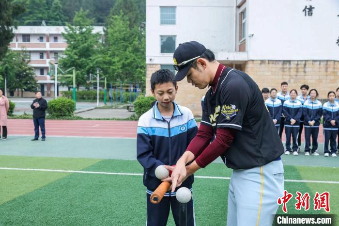 今年4月,臺青宋奇軒在北京合伙創(chuàng)辦“新世代棒球俱樂部”。圖為宋奇軒在四川省青川縣為當(dāng)?shù)貙W(xué)校開展公益棒球課項(xiàng)目。(受訪者供圖)