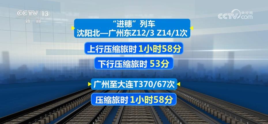 “進穗”列車沈陽北—廣州東Z12/3、Z14/1次上行壓縮旅時1小時58分,下行壓縮旅時53分,廣州—大連T370/67次壓縮旅時1小時58分。