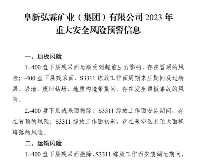 2021年2月,阜新市煤炭工業(yè)轉(zhuǎn)型發(fā)展局、遼寧煤監(jiān)局遼西監(jiān)察分局就曾發(fā)布2021年平安煤礦和弘霖煤礦重大安全風(fēng)險(xiǎn)預(yù)警信息,重大安全風(fēng)險(xiǎn)預(yù)判清單顯示,弘霖煤礦存在“超強(qiáng)度、超定員組織生產(chǎn)風(fēng)險(xiǎn)”“安全監(jiān)測監(jiān)控系統(tǒng)出現(xiàn)故障”等問題。