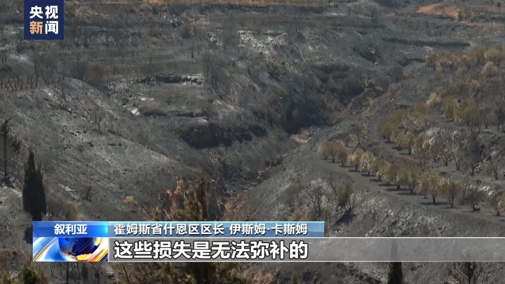 霍姆斯省什恩區(qū)區(qū)長(zhǎng) 伊斯姆·卡斯姆:大火蔓延了約430平方公里,這里種植了橄欖、蘋果、葡萄、無(wú)花果樹等,損失非常巨大。我們可以看到橄欖樹都被燒焦了,果農(nóng)損失了大概20年的橄欖產(chǎn)量,這個(gè)地區(qū)往年能產(chǎn)出約1.6萬(wàn)升的橄欖油,約1.6萬(wàn)升的蘋果醋,還有蘋果都能出口到鄰國(guó)。今年我們將面臨橄欖油和蘋果產(chǎn)量降低,這些損失是無(wú)法彌補(bǔ)的。