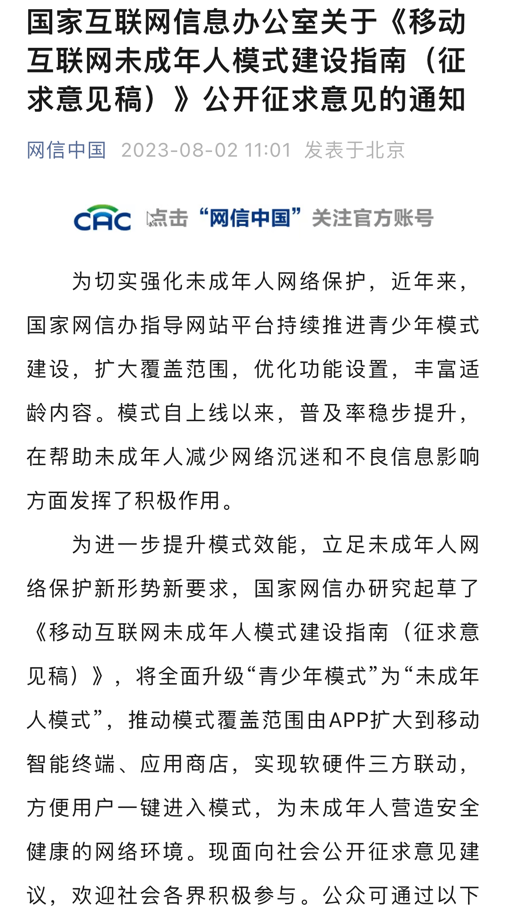 央廣網(wǎng)北京8月3日消息(總臺中國之聲記者馮爍)據(jù)中央廣播電視總臺中國之聲報道,為進一步幫助未成年人減少網(wǎng)絡(luò)沉迷和不良信息影響,國家網(wǎng)信辦8月2日發(fā)布了關(guān)于《移動互聯(lián)網(wǎng)未成年人模式建設(shè)指南(征求意見稿)》(以下簡稱《指南》)公開征求意見,將未成年人網(wǎng)絡(luò)保護的覆蓋范圍由App擴大到移動智能終端、應(yīng)用程序、分發(fā)平臺,把“青少年模式”升級為“未成年人模式”。相關(guān)部門如何給未成年人網(wǎng)絡(luò)保護設(shè)置護欄?
