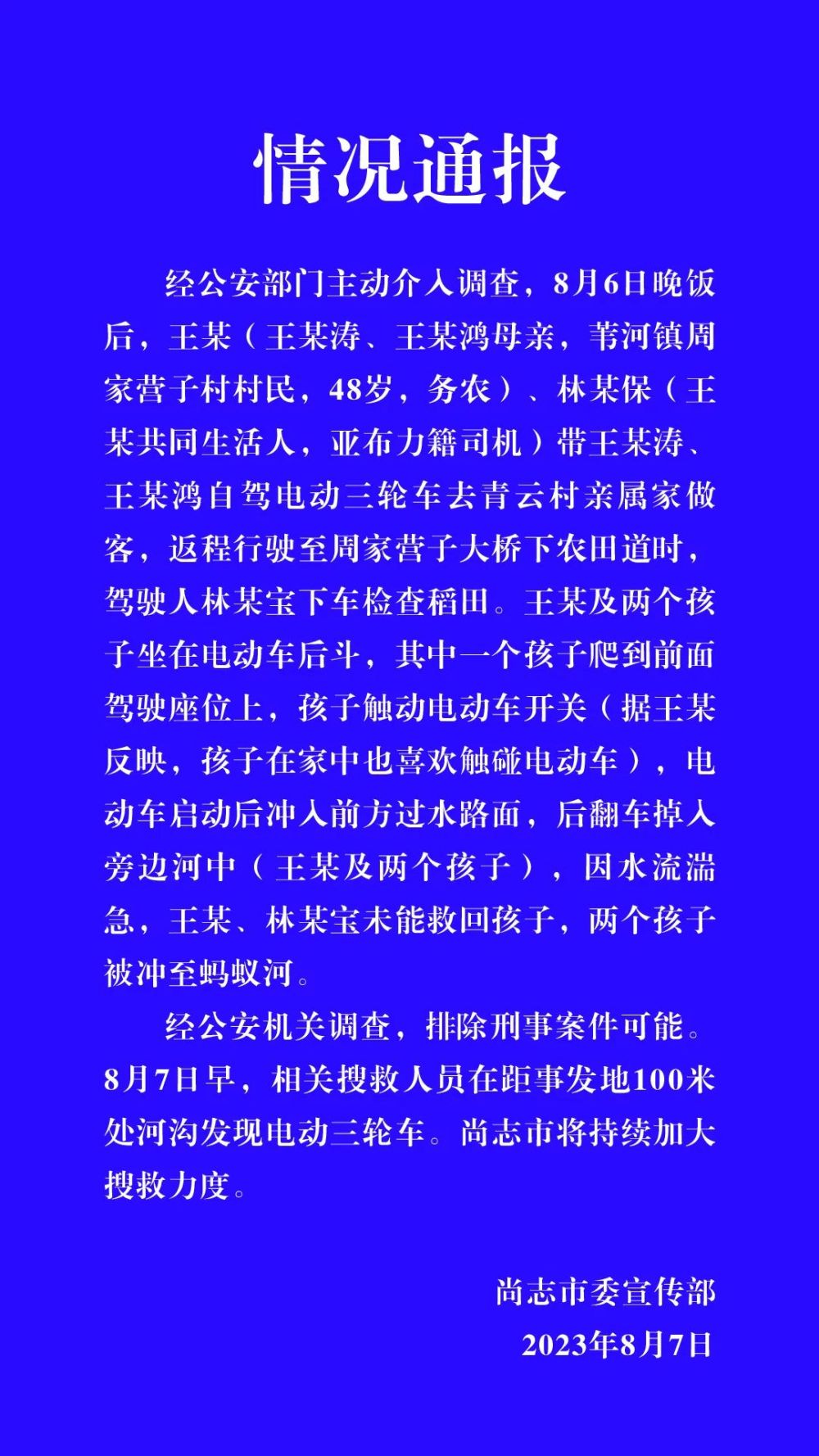 中新網(wǎng)8月8日電 據(jù)尚志市委宣傳部微信公眾號(hào)消息,經(jīng)公安部門主動(dòng)介入調(diào)查,8月6日晚飯后,王某(王某濤、王某鴻母親,葦河鎮(zhèn)周家營(yíng)子村村民,48歲,務(wù)農(nóng))、林某保(王某共同生活人,亞布力籍司機(jī))帶王某濤、王某鴻自駕電動(dòng)三輪車去青云村親屬家做客,返程行駛至周家營(yíng)子大橋下農(nóng)田道時(shí),駕駛?cè)肆帜硨毾萝嚈z查稻田。王某及兩個(gè)孩子坐在電動(dòng)車后斗,其中一個(gè)孩子爬到前面駕駛座位上,孩子觸動(dòng)電動(dòng)車開關(guān)(據(jù)王某反映,孩子在家中也喜歡觸碰電動(dòng)車),電動(dòng)車啟動(dòng)后沖入前方過水路面,后翻車掉入旁邊河中(王某及兩個(gè)孩子),因水流湍急,王某、林某寶未能救回孩子,兩個(gè)孩子被沖至螞蟻河。