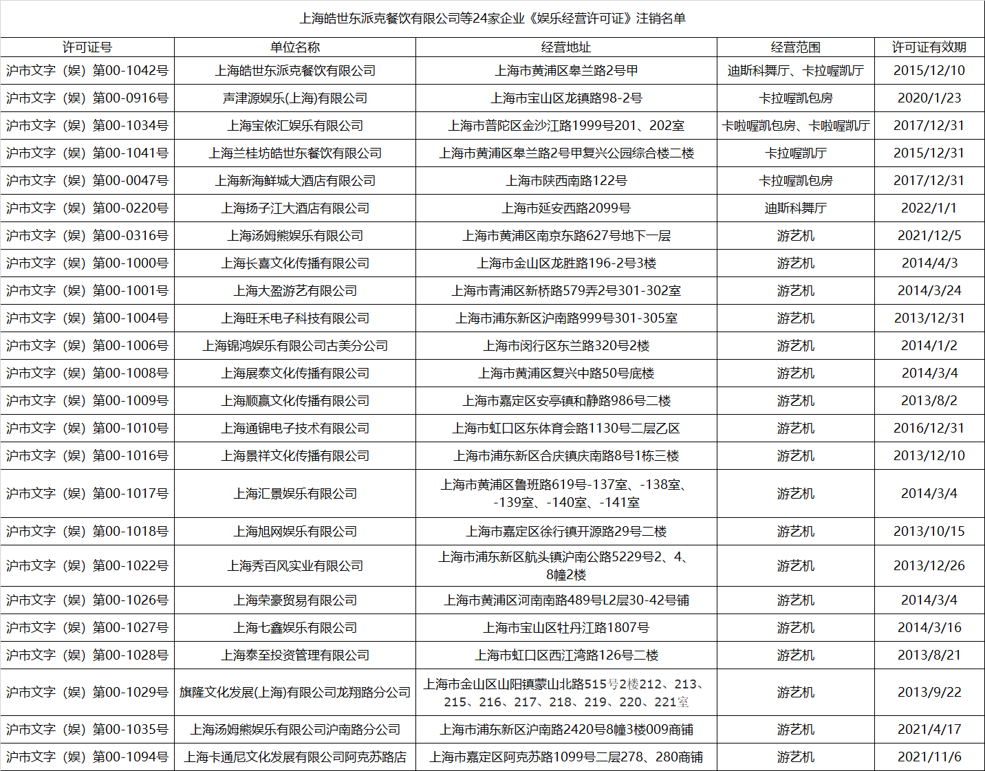 上海市24家企業(yè)被注銷《娛樂(lè)經(jīng)營(yíng)許可證》