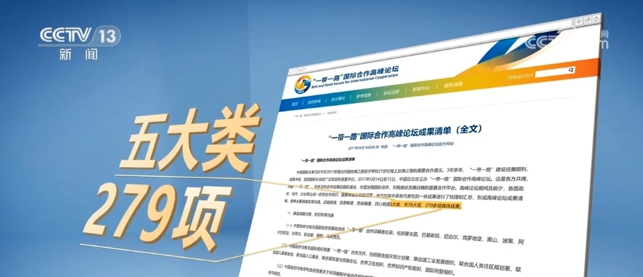 第一屆“一帶一路”國(guó)際合作高峰論壇誕生的首張成果清單,涵蓋了五大類(lèi)的279項(xiàng)具體成果。政策溝通、設(shè)施聯(lián)通、貿(mào)易暢通、資金融通、民心相通成為各國(guó)合作的重點(diǎn)。