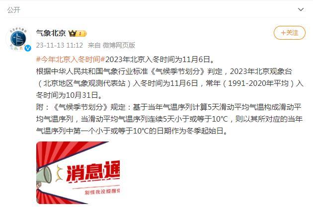 中新網(wǎng)11月13日電 據(jù)北京市氣象局官方微博13日消息,2023年北京入冬時間為11月6日。根據(jù)中華人民共和國氣象行業(yè)標(biāo)準(zhǔn)《氣候季節(jié)劃分》判定,2023年北京觀象臺(北京地區(qū)氣象觀測代表站)入冬時間為11月6日,常年(1991-2020年平均)入冬時間為10月31日。