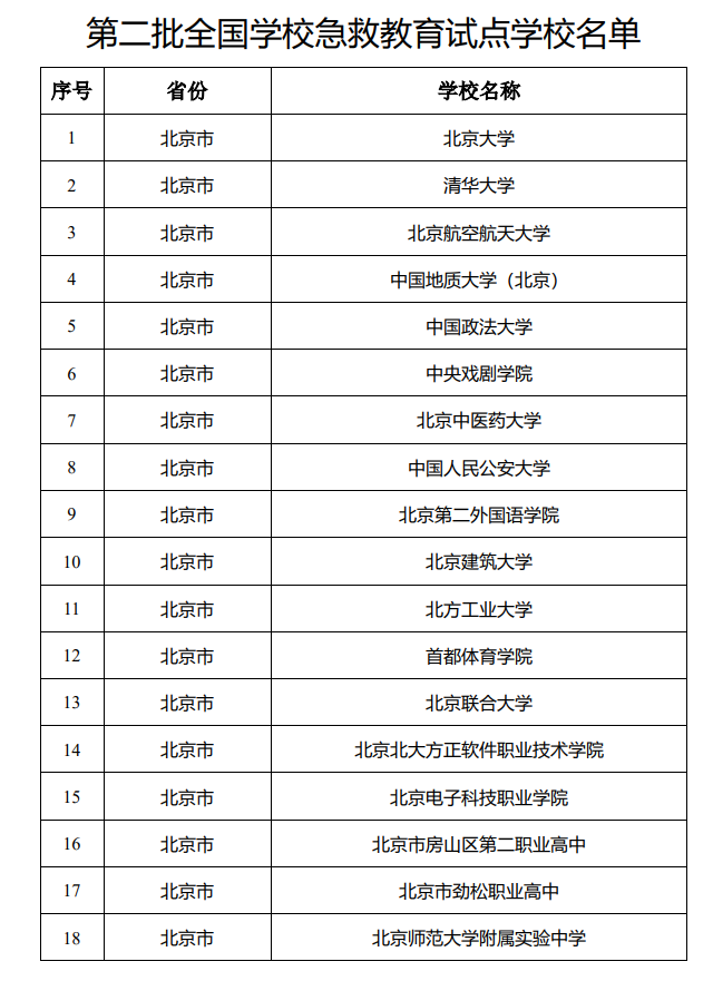 北京大學(xué)等1000所學(xué)校被確定為第二批全國學(xué)校急救教育試點學(xué)校