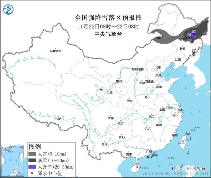 11月22日08時(shí)至23日08時(shí),內(nèi)蒙古東部、黑龍江中東部、吉林長白山區(qū)等地部分地區(qū)有大到暴雪,黑龍江中部偏南地區(qū)局地有大暴雪(20~27毫米),上述部分地區(qū)新增積雪深度6~15厘米,局地20厘米左右。