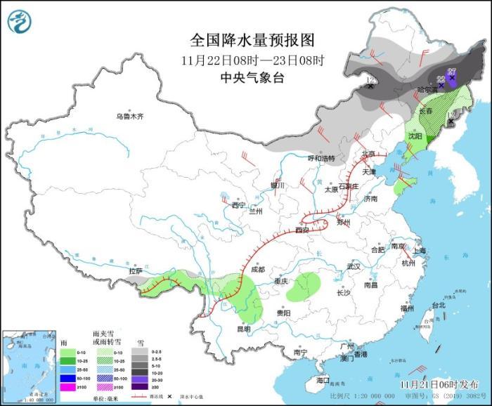 其中,11月21日08時(shí)至22日08時(shí),內(nèi)蒙古東部部分地區(qū)有大雪,局地有暴雪(10~12毫米),上述部分地區(qū)新增積雪深度3~8厘米。