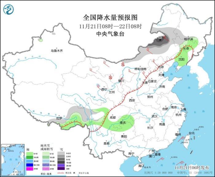 11月21日08時(shí)至22日08時(shí),內(nèi)蒙古東部、黑龍江西南部、吉林西部等地部分地區(qū)有小到中雪或雨夾雪,其中,內(nèi)蒙古東部局地有大到暴雪(10~12毫米)。吉林中部、遼寧大部、西藏東南部、四川盆地南部、重慶大部、貴州北部、云南東北部等地部分地區(qū)有小雨。西北地區(qū)中部和東北部、內(nèi)蒙古大部、華北西部和北部等地部分地區(qū)有4~6級風(fēng)。內(nèi)蒙古河套地區(qū)、甘肅河西等地局地有揚(yáng)沙(見圖6)。