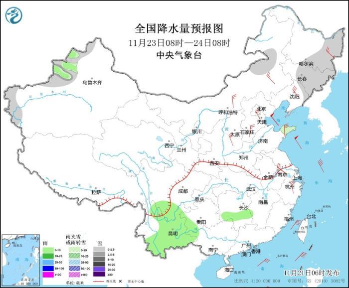11月23日08時(shí)至24日08時(shí),新疆西部、內(nèi)蒙古東部、東北地區(qū)中東部、山東半島等地部分地區(qū)有小雪或雨夾雪,局地有中雪。湖南南部、四川南部、云南大部等地部分地區(qū)有小雨。內(nèi)蒙古中東部、東北地區(qū)大部、華北大部、山東半島、江南東部等地部分地區(qū)有4~6級風(fēng)(見圖8)。