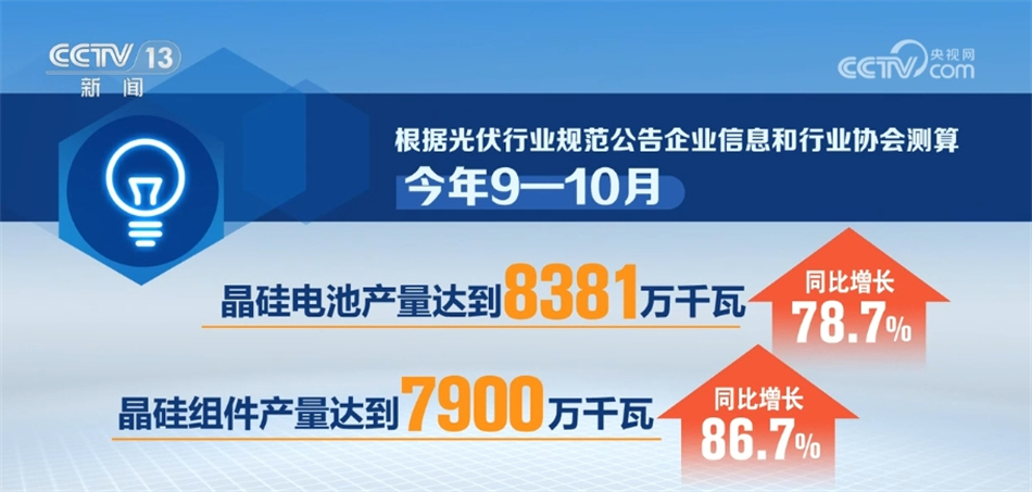 根據(jù)光伏行業(yè)規(guī)范公告企業(yè)信息和行業(yè)協(xié)會測算,今年9—10月,全國多晶硅產(chǎn)量達到23.66萬噸,同比增長90%;硅片產(chǎn)量8795萬千瓦,同比增長61%;晶硅電池、晶硅組件產(chǎn)量分別達到8381萬千瓦、7900萬千瓦,同比分別增長78.7%、86.7%。