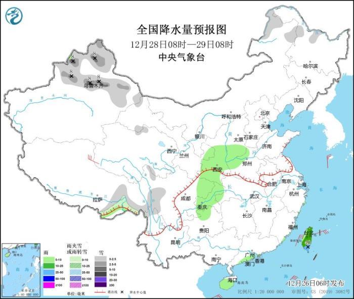 12月28日08時至29日08時,內(nèi)蒙古東北部、黑龍江西北部、新疆北部、西藏東部等地部分地區(qū)有小雪或雨夾雪,其中,新疆北疆北部和沿天山地區(qū)等地部分地區(qū)有中到大雪(5~8毫米)。西北地區(qū)東部、華北南部、黃淮西部、西南地區(qū)東部、臺灣島等地部分地區(qū)有小到中雨,其中,臺灣島等地部分地區(qū)有大雨(25~40毫米)。青海西部部分地區(qū)有5~6級風(fēng)(見圖3)。